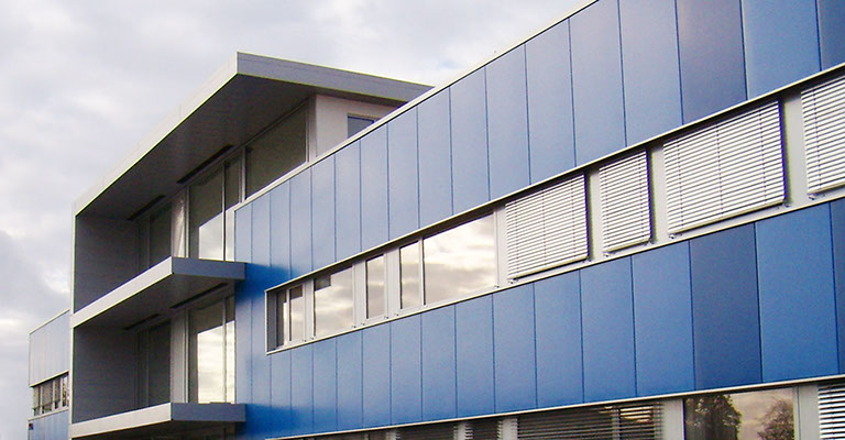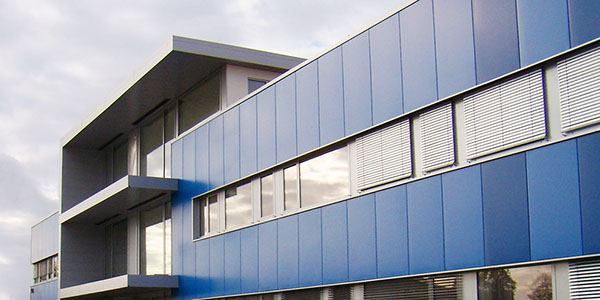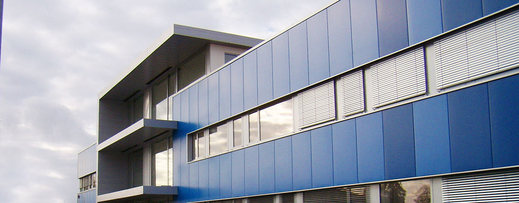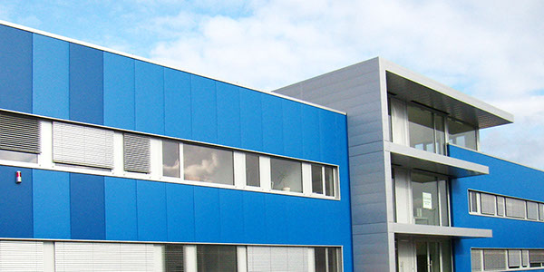 Montage einer Fassadenverkleidung für ein kombiniertes Büro und Produktionsgebäude in Heddesheim bei Mannheim. Die Verkleidung wurde mit Thermowandelementen realisiert. Auf Wunsch wurde die Farbgestaltung im NCS Farbensystem vorgenommen, wodurch sich das Gebäude perfekt in die Umgebungslandschaft integriert.