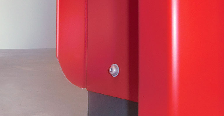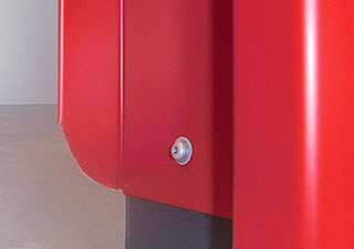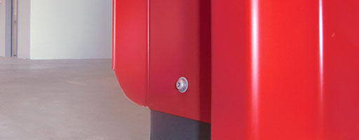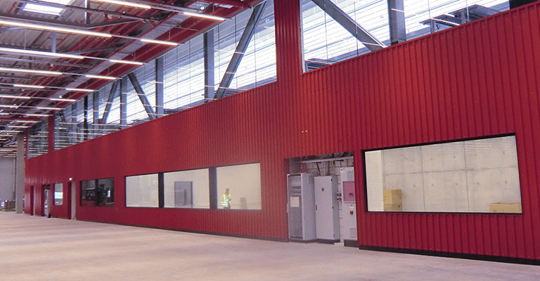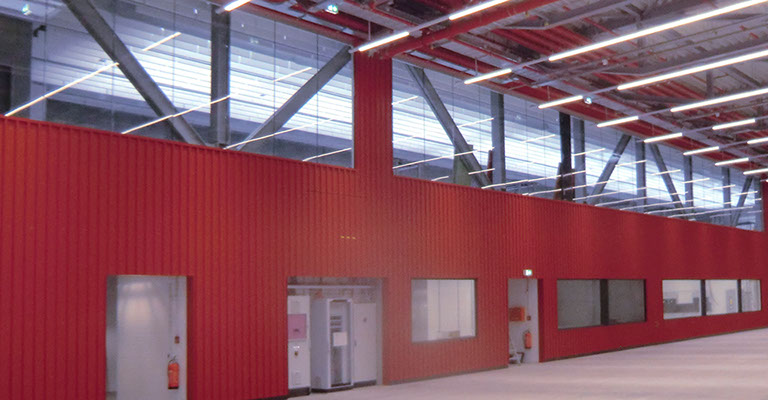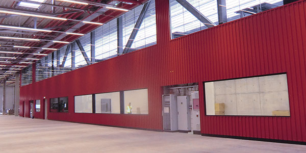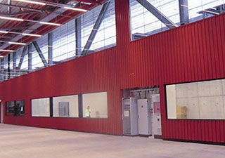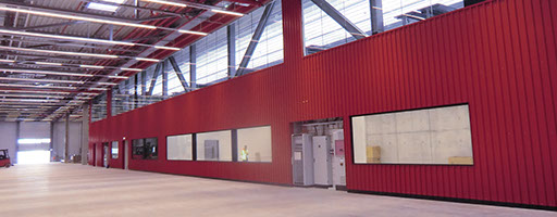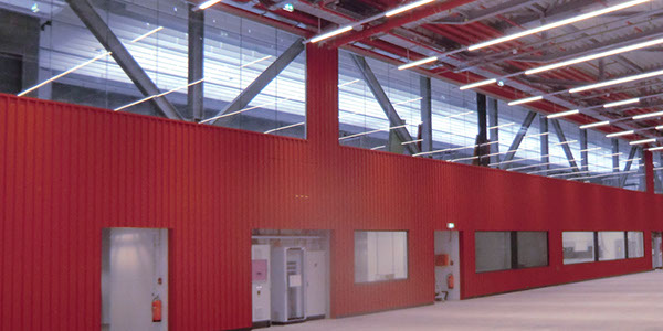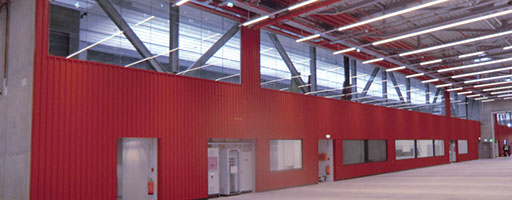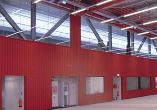 Diese Innenwandverkleidung besteht aus Trapezblechen, welche auf einer Aluminium-Unterkonstruktion befestigt wurden. Der Corporate Identity des weltweit agierenden Unternehmens aus Aschaffenburg entsprechend, wurden die Trapezbleche in der Unternehmensfarbe des Kunden versehen.